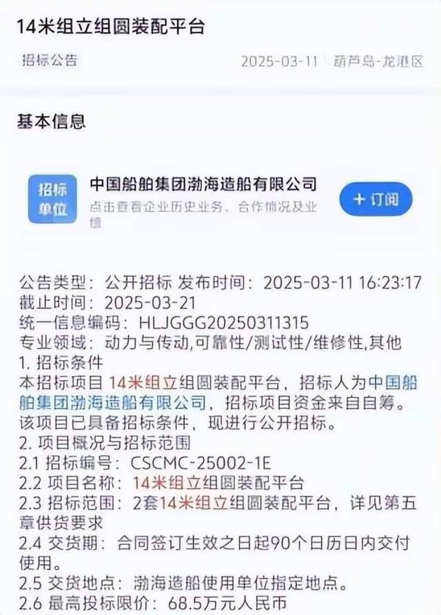 2025年3月份的时候,渤海造船厂发布了一份招标文件,文件显示渤海造船厂正计划采购“14米组立组圆装配平台”。