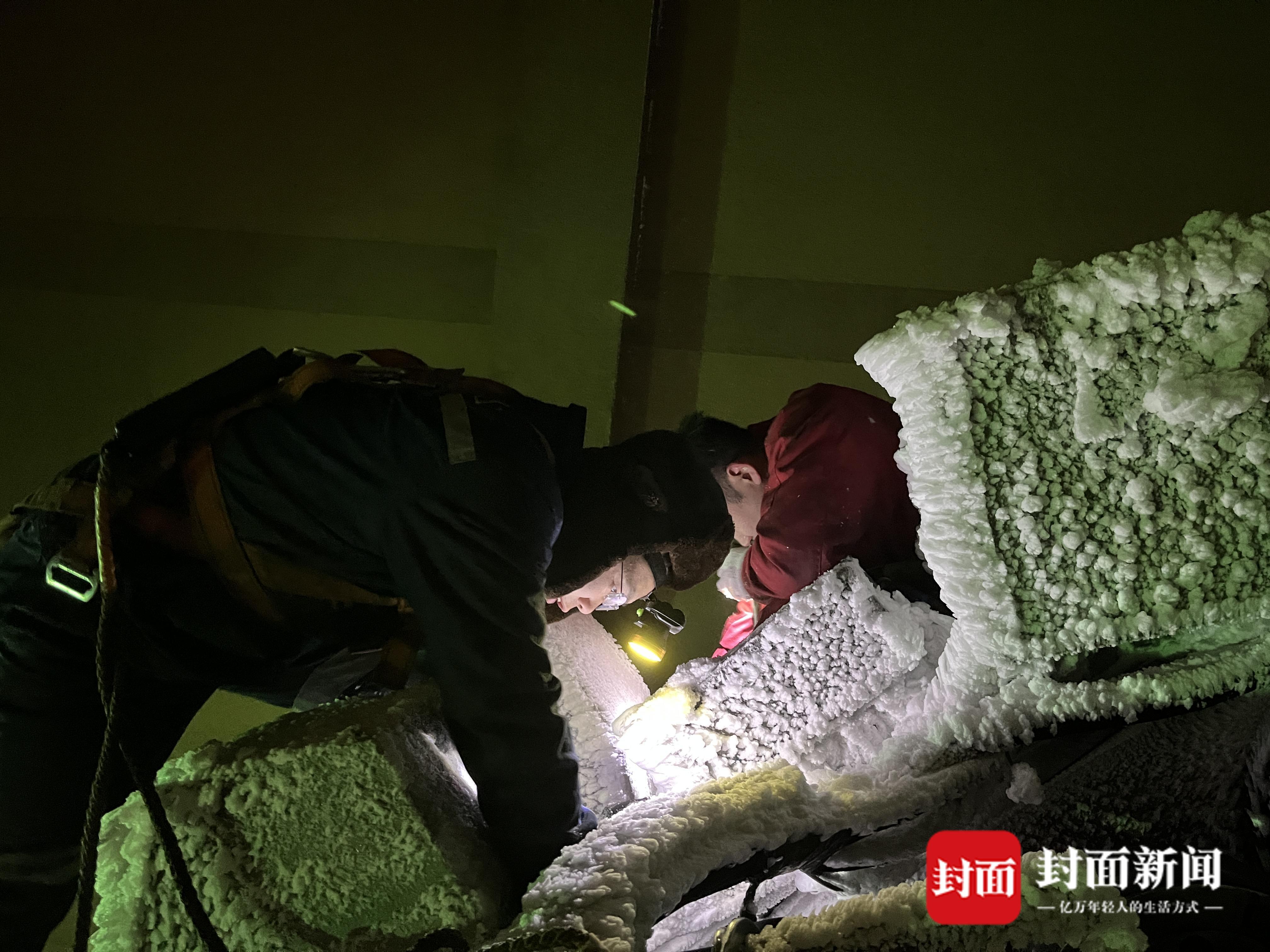 当天早上6点30分,峨眉山还笼罩在黑夜里,缆绳上挂着薄薄的雪痕。几位系着安全绳、头戴安全帽的工作人员爬上车厢,逐个检查起缆车的各项零部件,检查完后,工作人员还要坐着缆车上下往返检查。